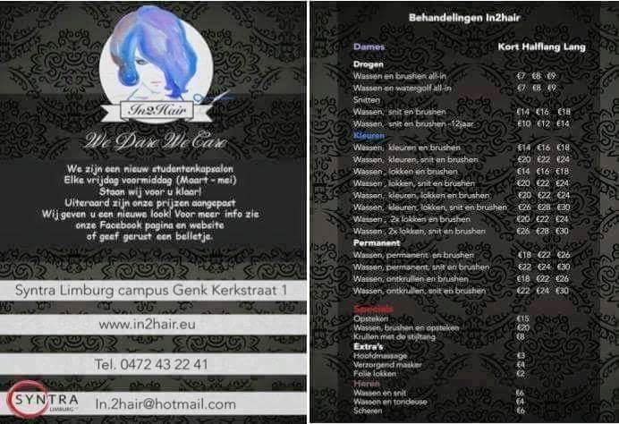 Wij zijn leerlingen van de kappersopleiding te syntra Genk. We organiseren een kappersalon waar u voor al uw haar wensen bij ons terecht kunt. Het bezoek aan ons salon is meer dan alleen een kappersbezoek. Het is een aangename belevenis. Wij nemen de tijd om eerst te overleggen wat uw wensen zijn. Wilt u een andere coupe, laat ons u dan uitgebreid adviseren! Maar, natuurlijk respecteren wij altijd uw wensen, dus kom gerust bij ons langs. In2hair gebruikt altijd uitstekende haarproducten van de hoogste kwaliteit.